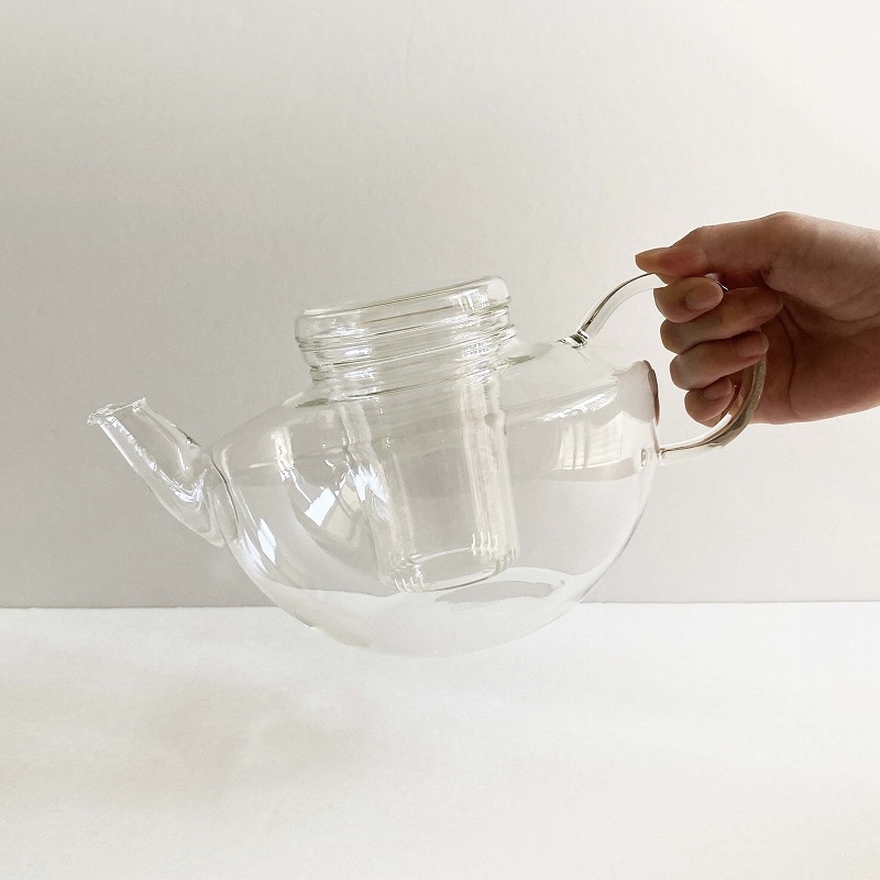 ポット本体、フタ、ストレーナーすべてがガラス製。コロンと丸いシルエット、透き通るクリアな透明感も相まって心に残る印象的なデザイン。取っ手は幅をやや太めにしているので意外と持ちやすいです。